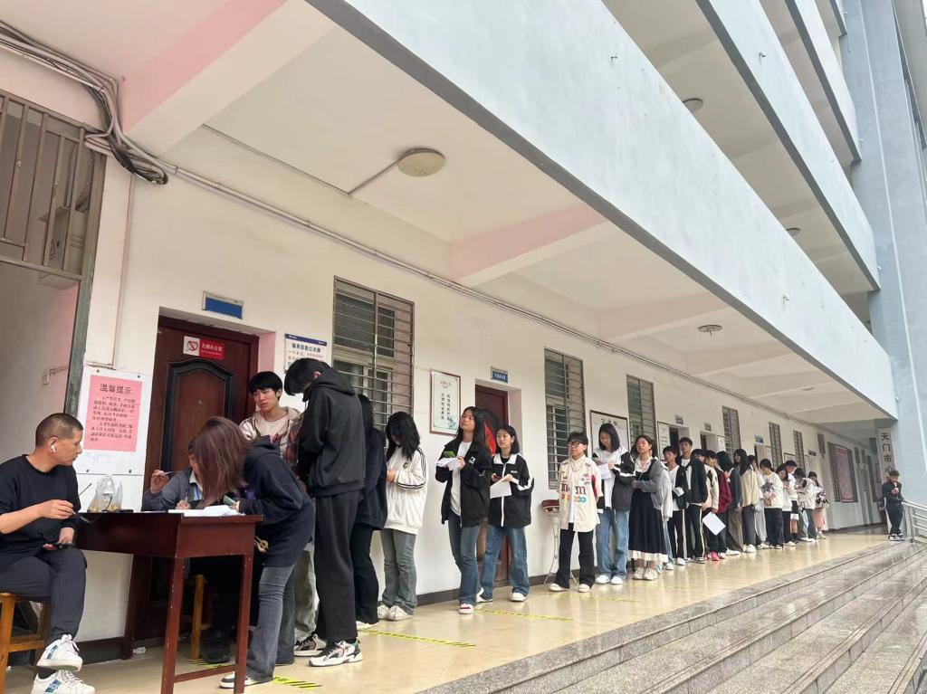 考试当天,参试学生提前在校门口集合,由专人带队提前到达考点,按要求查验身份证和准考证。测试期间,考场纪律良好,考生们认真参考、秩序井然。
