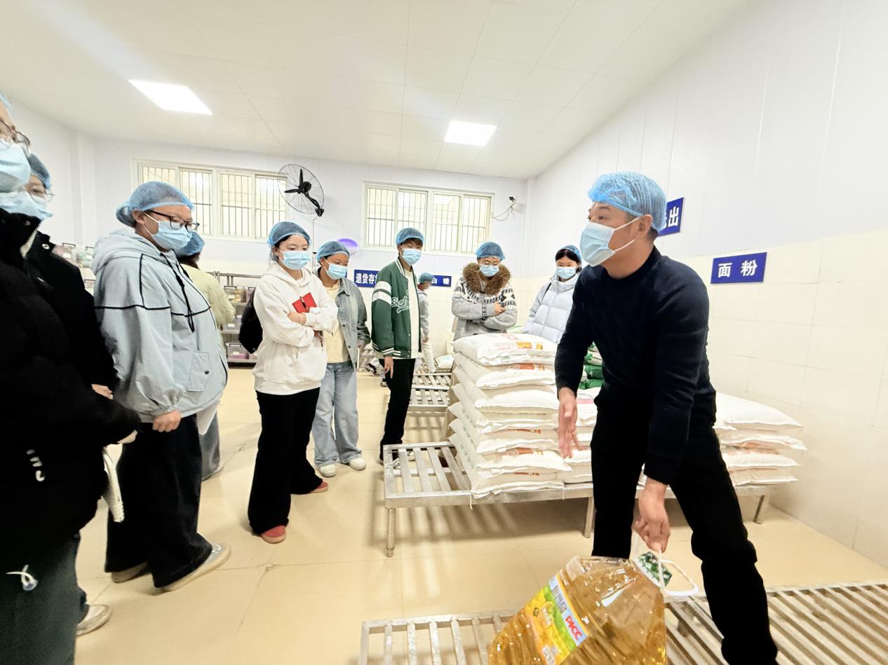 活动伊始,在学生食堂餐饮管理中心工作人员的带领下,学生代表们先后参观了食堂一、二楼的后厨操作区。大家实地走访了食材储存仓库、食品加工区、餐具消毒间等关键区域,详细了解食材采购、储存、加工的全流程管理。整洁的环境、规范的操作流程以及严格的食品安全管理制度给同学们留下了深刻印象。
